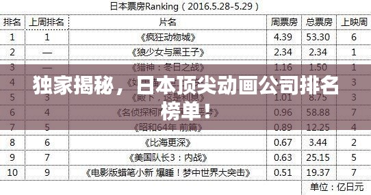日本是動畫產(chǎn)業(yè)高度發(fā)達的國家,擁有眾多知名的動畫公司,這些公司通過制作高質量的動畫作品,贏得了全球觀眾的喜愛,本文將介紹日本幾大動畫公司的排名。