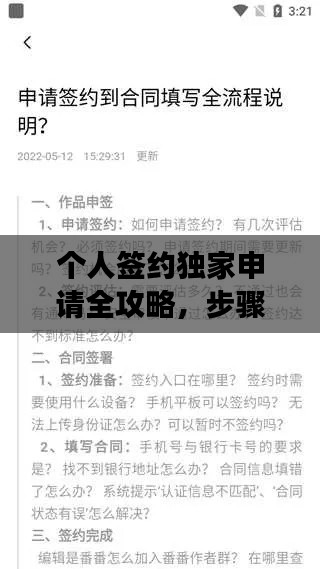在數(shù)字化時代,個人簽約申請獨家已經(jīng)成為許多創(chuàng)作者追求個人發(fā)展和保護(hù)創(chuàng)作成果的重要途徑,無論是音樂、文學(xué)、藝術(shù)還是其他領(lǐng)域,掌握個人簽約申請獨家的方法顯得尤為重要,本文將詳細(xì)介紹個人簽約申請獨家的步驟、注意事項以及策略,幫助創(chuàng)作者更好地實現(xiàn)個人發(fā)展。